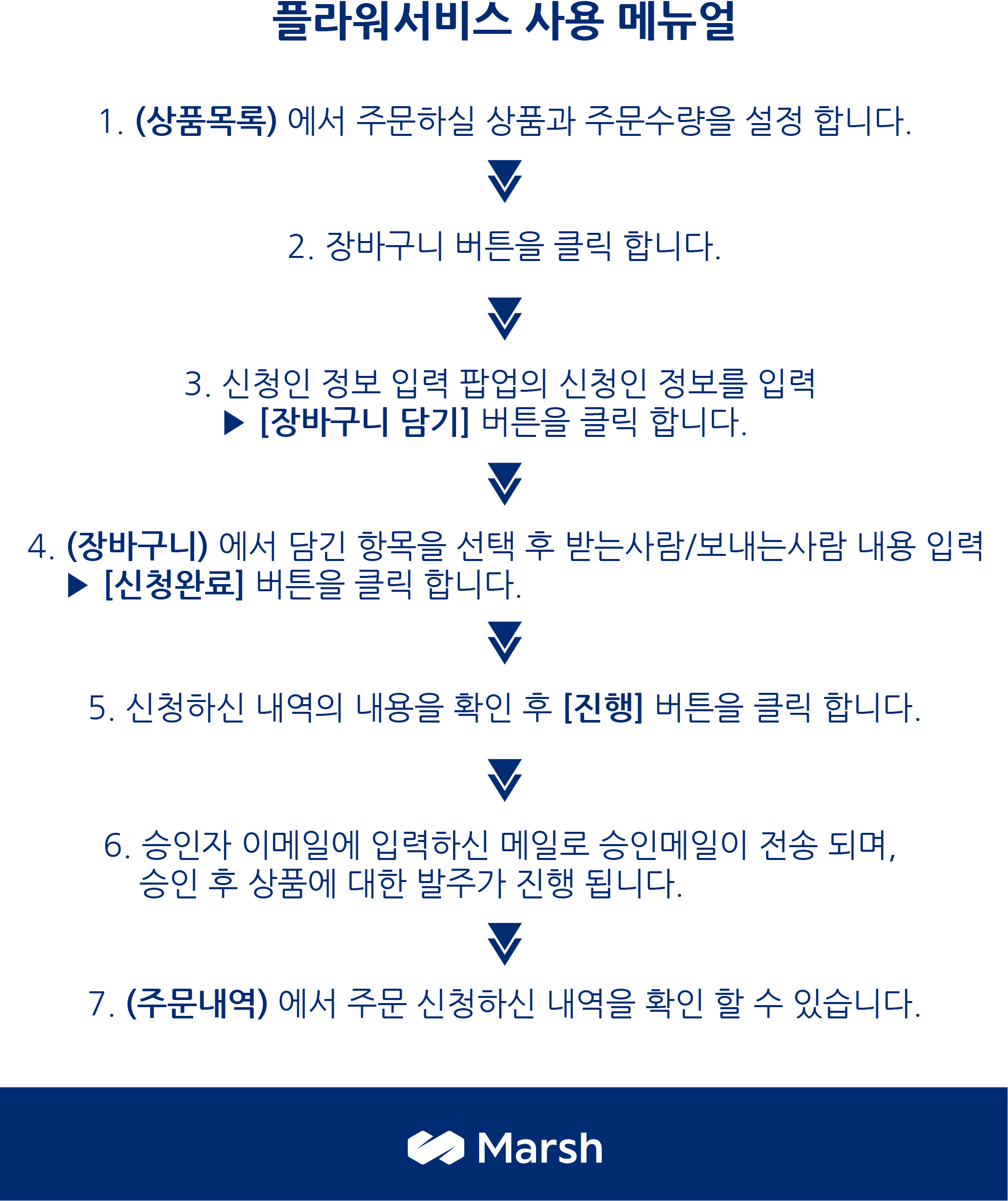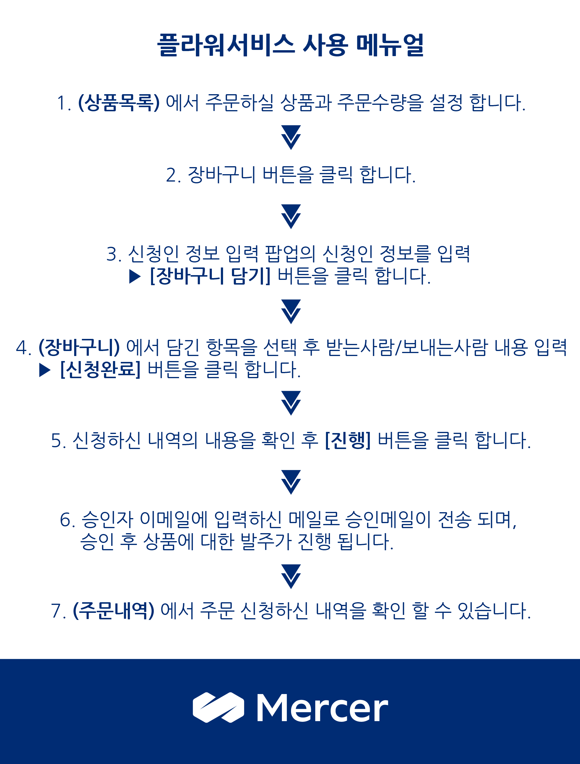 예시) "마쉬(or머서)코리아 XX팀 ooo입니다. 아래의 주소로 xxxx품목 발송신청합니다.